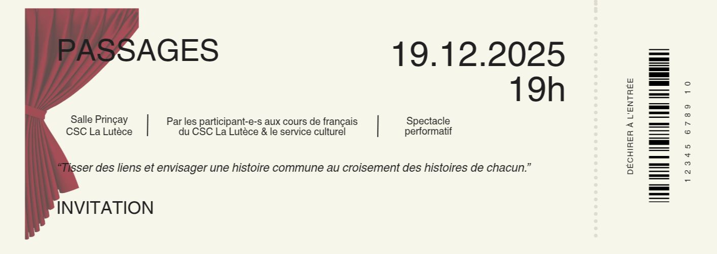 Ce vendredi 19 décembre 2025, nous avons le plaisir de présenter un format hors les murs adapté du projet PASSAGES. Il s’agit d’un spectacle performatif où le spectateur déambule librement à la recherche des questions qui entourent l’universalité, et donc, « l’autre »; un parcours artistique qui propose aux participants, tous âges confondus, de réfléchir et questionner nos différences et nos ressemblences en tant qu’êtres humains et de créer ainsi un endroit de rencontre. Une rencontre qui donne la place de s’exprimer et de s’écouter afin peut-être d’aller au-delà d’une image préétablie de l’autre. Tisser des liens et envisager une histoire commune au croisement des histoires de chacun, afin de pouvoir appréhender la beauté de ce qui nous ressemble et rassemble: la beauté de l’humain, du vivant et du monde.